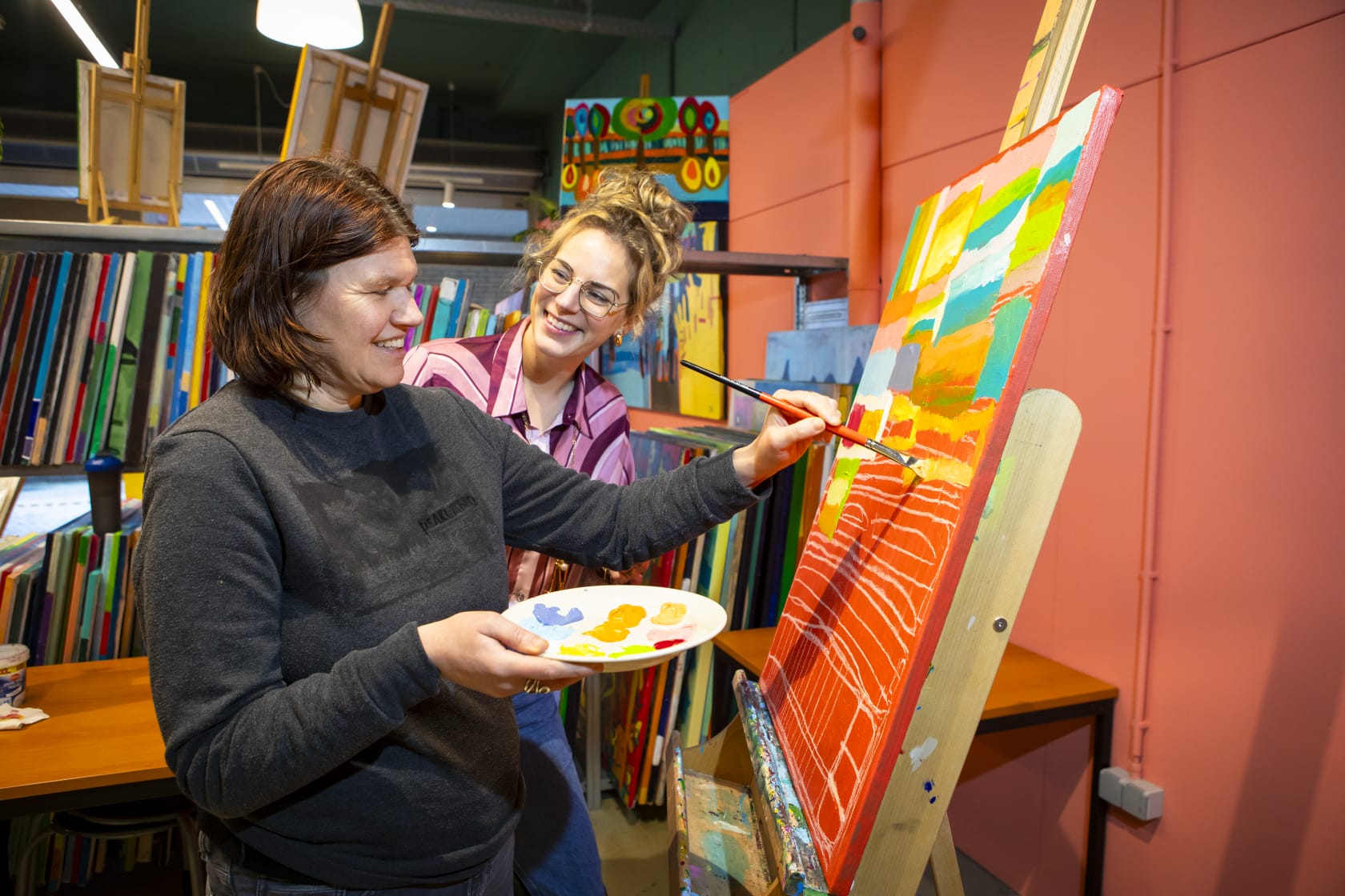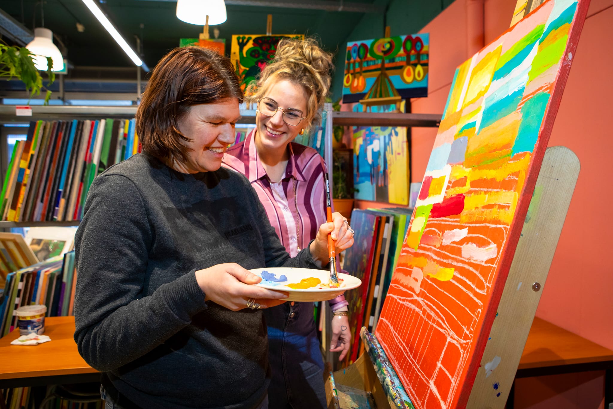 - Silvia Vrolijk met kunstenares Patricia in het atelier