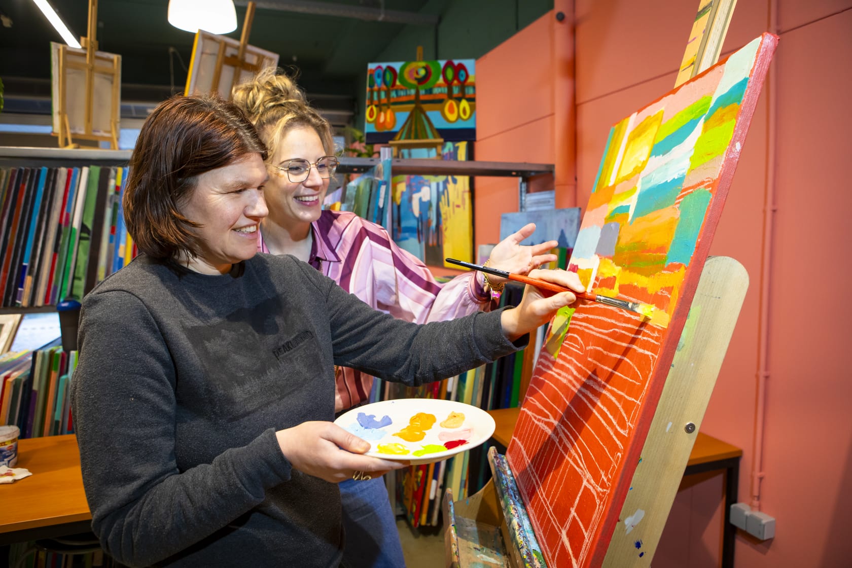 Beste vriendinnen Patricia en Sofie komen al jaren in het atelier en hebben al heel wat werken gemaakt. De plek heeft hen veel gebracht. Zo hebben ze elkaar en zichzelf beter leren kennen door de kunst.