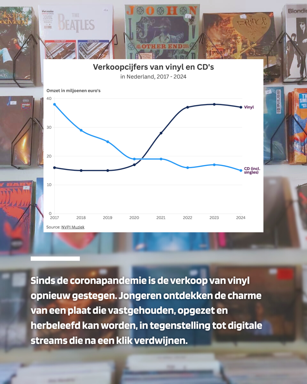 Sinds de coronapandemie is de verkoop van vinyl opnieuw gestegen. Jongeren ontdekken de charme van een plaat die vastgehouden, opgezet en herbeleefd kan worden, in tegenstelling tot digitale streams die na een klik verdwijnen. Volgens de brancheorganisatie NVPI Muziek is de verkoop van vinyl meer dan verdubbeld tussen 2017 en 2024.