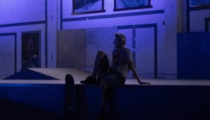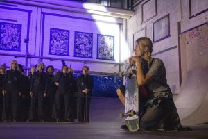 Ze glijdt met haar skateboard over het beton alsof het ijs is. Haar blik is gefocust en standvastig. Ze kijkt nooit ergens heen, valt me op. Ze kijkt het publiek in, maar niet naar iemand. Achter haar echoën de stemmen van het koor. Gepaard met het orkest geeft het een episch geluid.