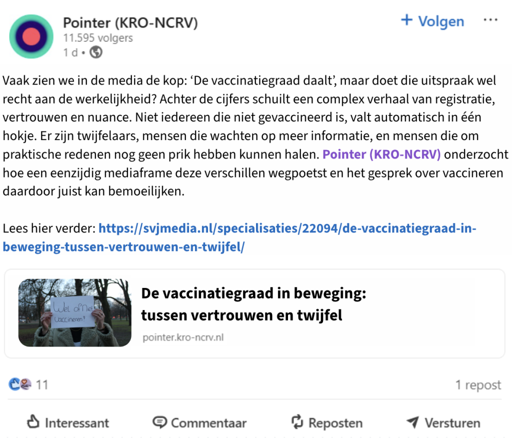 In de media overheerst het frame van “de dalende vaccinatiegraad”. Maar dat beeld is volgens Van Lier te eenzijdig. ‘Net voor de coronapandemie zagen we de deelname aan de bof, mazelen en rodehond (BMR) vaccinatie juist weer heel licht stijgen. Ik merk dat er in de berichtgeving veel nadruk licht op een “voortdurende daling” terwijl de meeste ouders nog steeds hun kind laten vaccineren. Al is de vaccinatiegraad natuurlijk wel lager dan in het verleden en zijn er ook grote verschillen tussen groepen.’