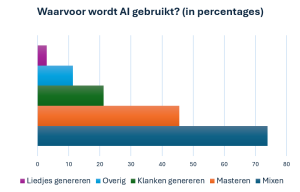 Zoals je kunt zien wordt AI in de muziekwereld voor verschillende dingen ingezet. Het volledig genereren van nummers is nog maar 3% van het volledige AI gebruik. Tegenwoordig wordt het vooral ingezet om audio te mixen en masteren
