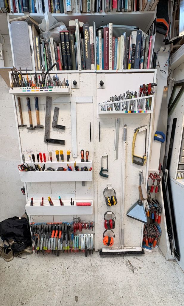 Midden in het atelier staat een grote, stevige stoel op wieltjes. Geen pronkstuk, maar eerder een soort werkstoel. De vloer is glad, waar verf op kan spatten zonder dat het tussen scheurtjes en kieren verdwijnt. Alles in de ruimte lijkt gericht op functioneren. Niet om indruk te maken, maar echt om er lekker te kunnen werken.
