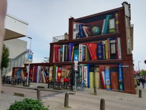 De enorme boekenkast-muurschildering van JanisDeMan op de Mimosastraat in Utrecht. Bron: Wikimedia Commons