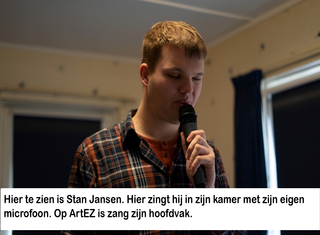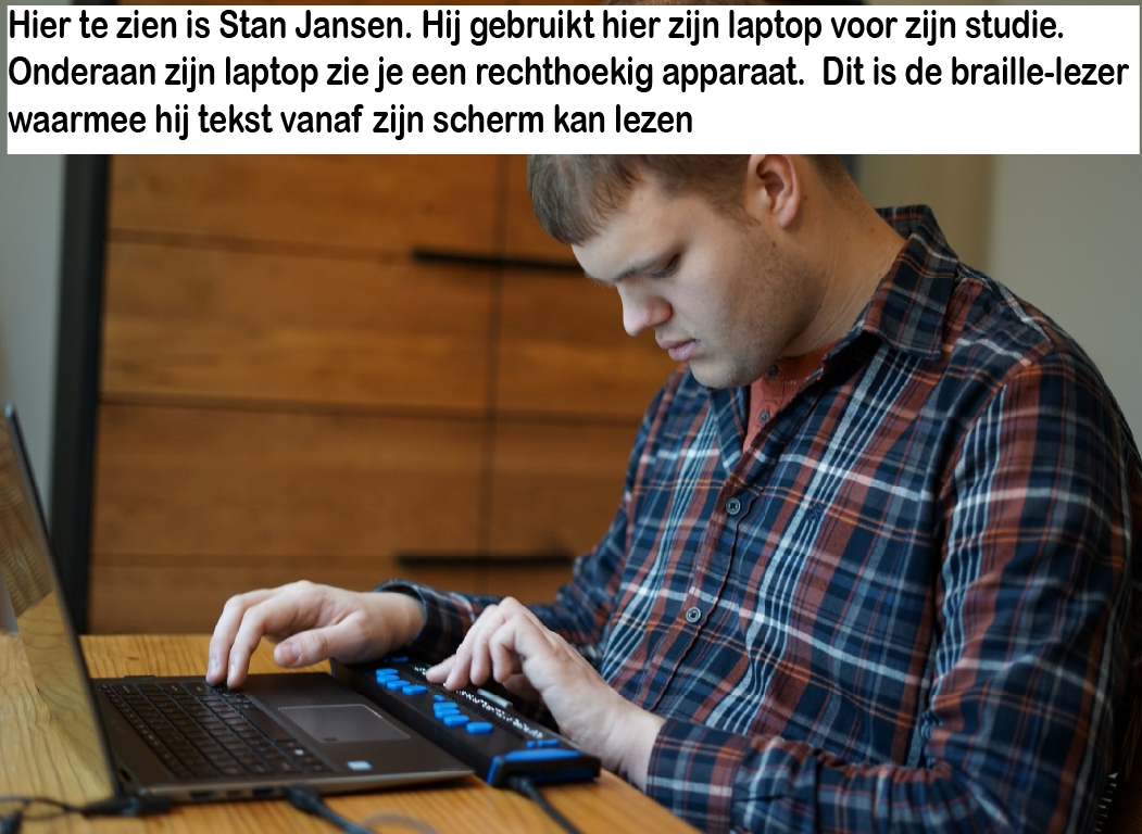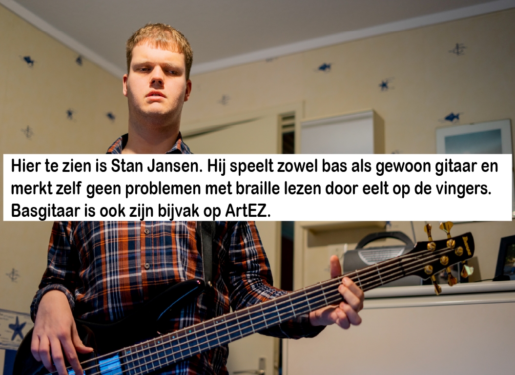 Stan is een derdejaars student aan ArtEZ in Enschede en is zelf volledig blind. Zelf speelt hij basgitaar, drums, gitaar en zingt hij. Voor zijn studie heeft hij als hoofdvak zang waarnaast hij ook de basgitaar als bijvak meeneemt. Hij is ooit begonnen met drummen wat al niet een heel standaard instrument is voor iemand die blind is. Hij vertelt daarnaast dat gitaar spelen ook niet heel standaard is voor blinde mensen. Dit komt door de eeltvorming op de vingers, waardoor iemand mogelijk braille minder goed kan lezen. Toch laat dat alles Stan niet stoppen om zijn passie voor muziek te ontdekken. Zo heeft hij al wel een muzikale studie op het mbo met succes weten af te ronden. Om zijn studie goed te kunnen volgen gebruikt hij als extra hulpstuk een braille lezer die aangesloten is op zijn laptop. Hiermee kan hij lezen wat er op het scherm te zien is. Wanneer hij grote bestanden moet lezen zoals verslagen gebruikt hij vaak de spraakfunctie op zijn computer. Hoe het voor hem is om een muziekstudie vertelt hij in het volgende fragment: