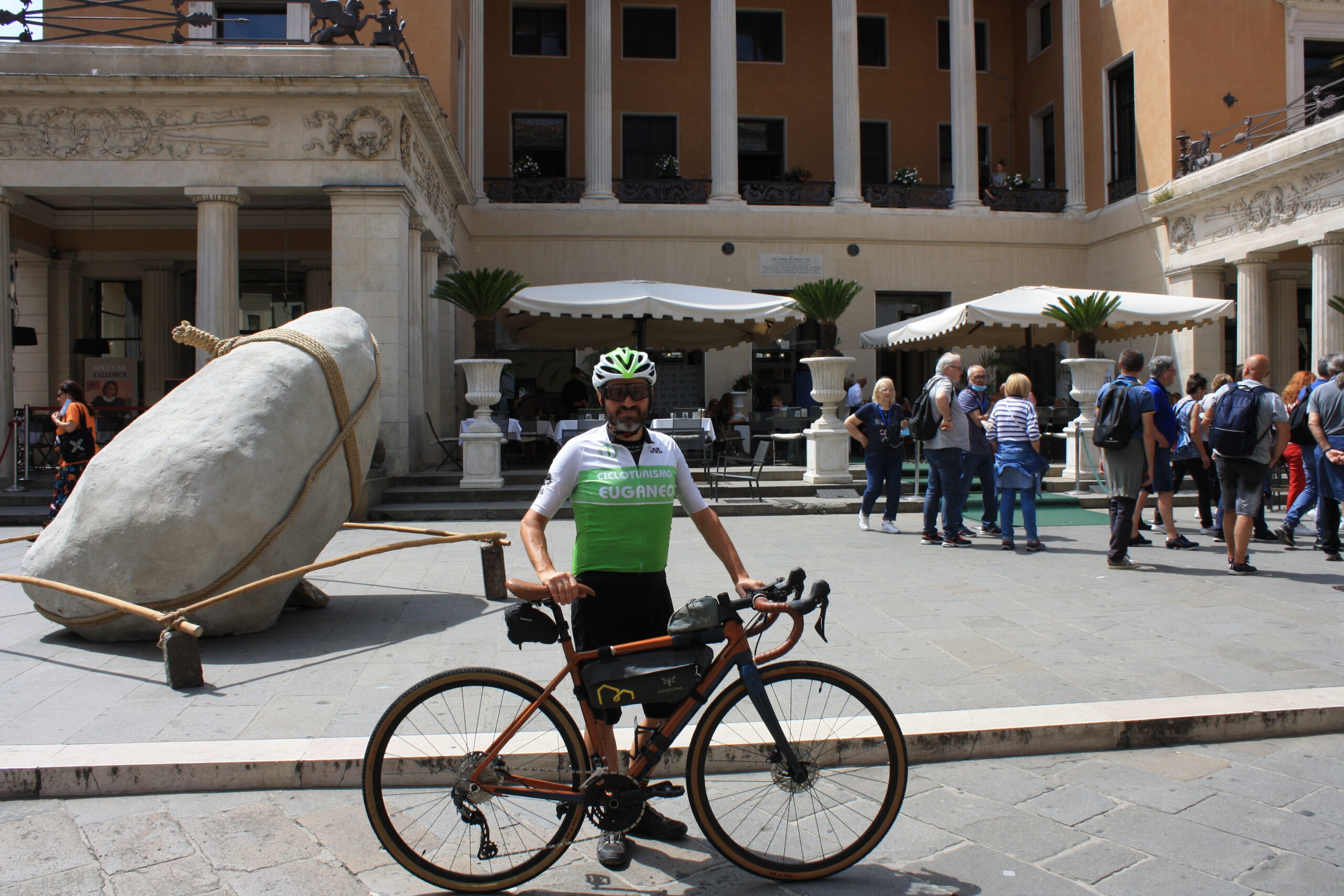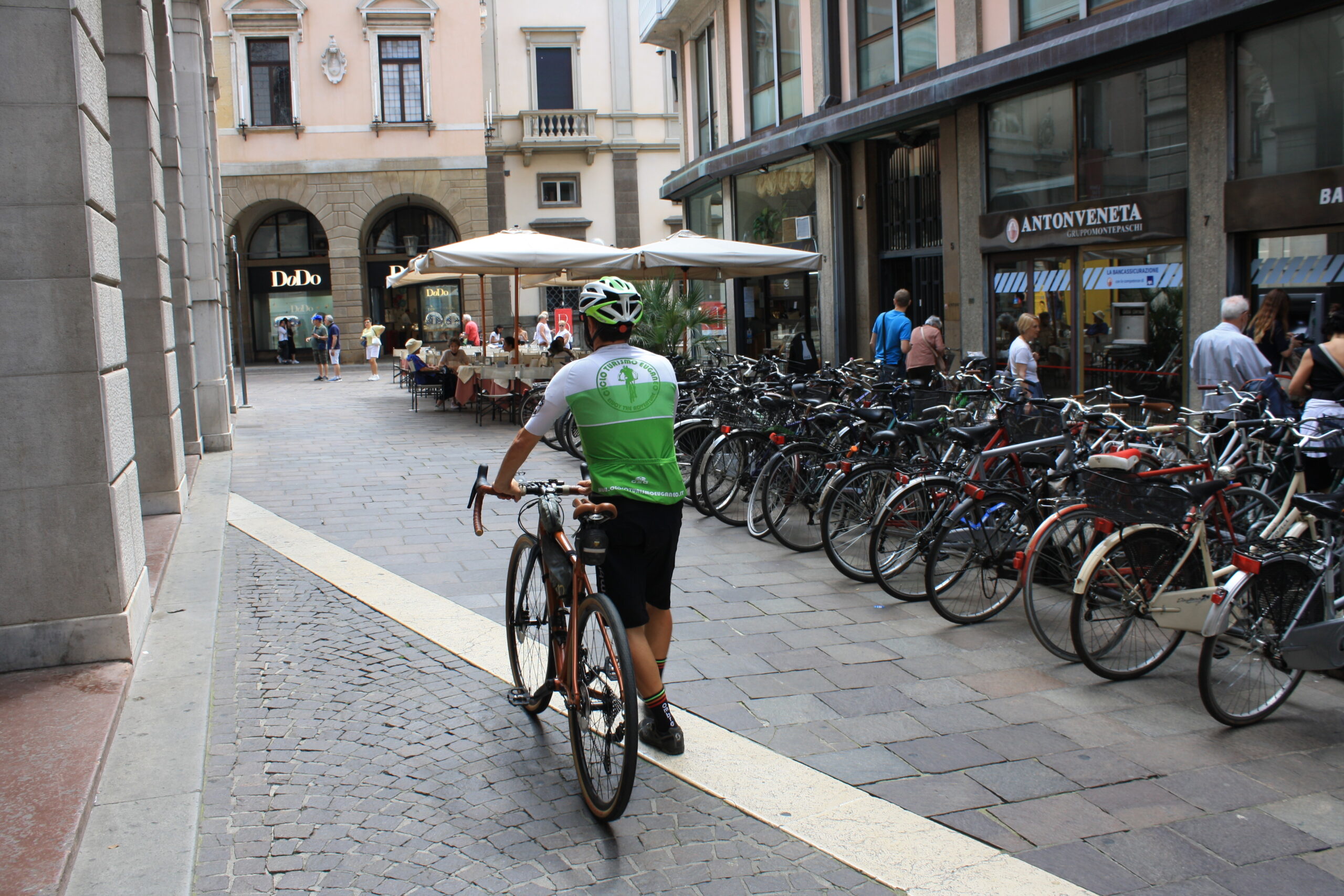 Oprichter Francesco Benetazzo van Ciclo Turismo Euganeo komt fietsend aan met zijn eigen, modieuze gravelbike naar Piazza delle Erbe, het middelpunt van de stad Padua, om te vertellen over zijn werkzaamheden en een rondleiding te geven door het historische centrum van Padua. Al 15 jaar lang fietst hij actief en in 2015 is hij afgestudeerd als mountainbike instructeur. Mountainbiken is 50 procent van zijn bedrijf Ciclo Turismo Euganeo, waar hij zich sinds drie jaar volledig op focust. “Er was in onze regio, rondom de Euganische Heuvels, niet echt een bedrijf die zich bezighield met fietstoerisme. Dus ik ben het toen begonnen naast mijn andere baan.” Eerst werkte hij voor een modebedrijf, maar hij is zijn droom achterna gegaan om in het fietstoerisme te werken. Er is nu, in 2022, ook meer ontwikkeling in de regio, en daar is hij blij mee. Benetazzo ontwikkelt zich ook steeds verder met zijn bedrijf. “Ik probeer alle fietsritten te personaliseren, want iedereen is anders. De ene wil graag de berg op met een elektrische fiets, de ander wil graag beter worden in het mountainbiken en weer iemand anders wil fietsen over de heuvels richting het historische centrum en wil meer weten over de geschiedenis van Padua.” En dit centrum in Padua staat sinds 2021 met zijn acht religieuze en wereldlijke complexen op de UNESCO werelderfgoedlijst. “Ik geloof wel dat meer toeristen hierdoor naar Padua in plaats van Venetië gaan. Op deze manier wordt het toerisme verspreid over de regio en dit is beter voor de natuur”, zegt Benetazzo lopend door de straat waar het bekende Café Pedrocchi ligt.