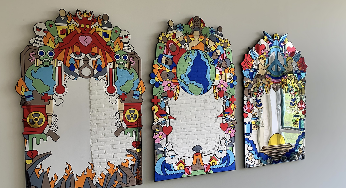 De achterliggende betekenis wil JUKKA overbrengen zonder daadwerkelijk uitleg te geven over de kunstwerken, maar hij beseft zich dat iedereen zich anders kan voelen bij zijn kunstwerken. Sophia probeert zich te verplaatsen in hem: “Ik denk dat ik het snap: Je kijkt in de spiegels, en je ziet de realiteit zoals je het zelf wilt zien. Wil je meer rijkdom? Dan voel je je misschien meer aangetrokken tot de ‘Raining Money Mirrors’. Ben je een groot voorstander van de hemel, de aarde zoals die nu is, of juist de hel? Dan spreekt deze spiegelreeks je misschien meer aan. Ik denk dat JUKKA de consument juist een beetje wil afleiden van de realiteit door deze wat mooier te maken als je in de spiegels kijkt. Het is bij de ‘Heaven Mirror’, de ‘Earth Mirror’, en de ‘Hell Mirror’ ook alsof we van hel naar aarde gaan, om vervolgens te eindigen bij de hemel. Hierin kun je zien hoe de hel erg volgens de kunstenaar uitziet en wat het verschil is met de aarde. In de spiegel van de aarde zie je nog wel duistere dingen vanuit de hel terugkomen – zoals vuur – zodat hij kan overbrengen dat de aarde niet altijd een goede plek is. De aarde heeft ook aspecten van de hemel – zoals bloemen en hartjes – om te weergeven dat het niet allemaal slecht is op aarde. De hemel weerspiegelt zijn visie op dit aspect en hoe mooi het kan zijn. Ik vind het mooi dat de spiegels ervoor zorgen dat je over een onderwerp na gaat denken, zodat het je kan inspireren.”