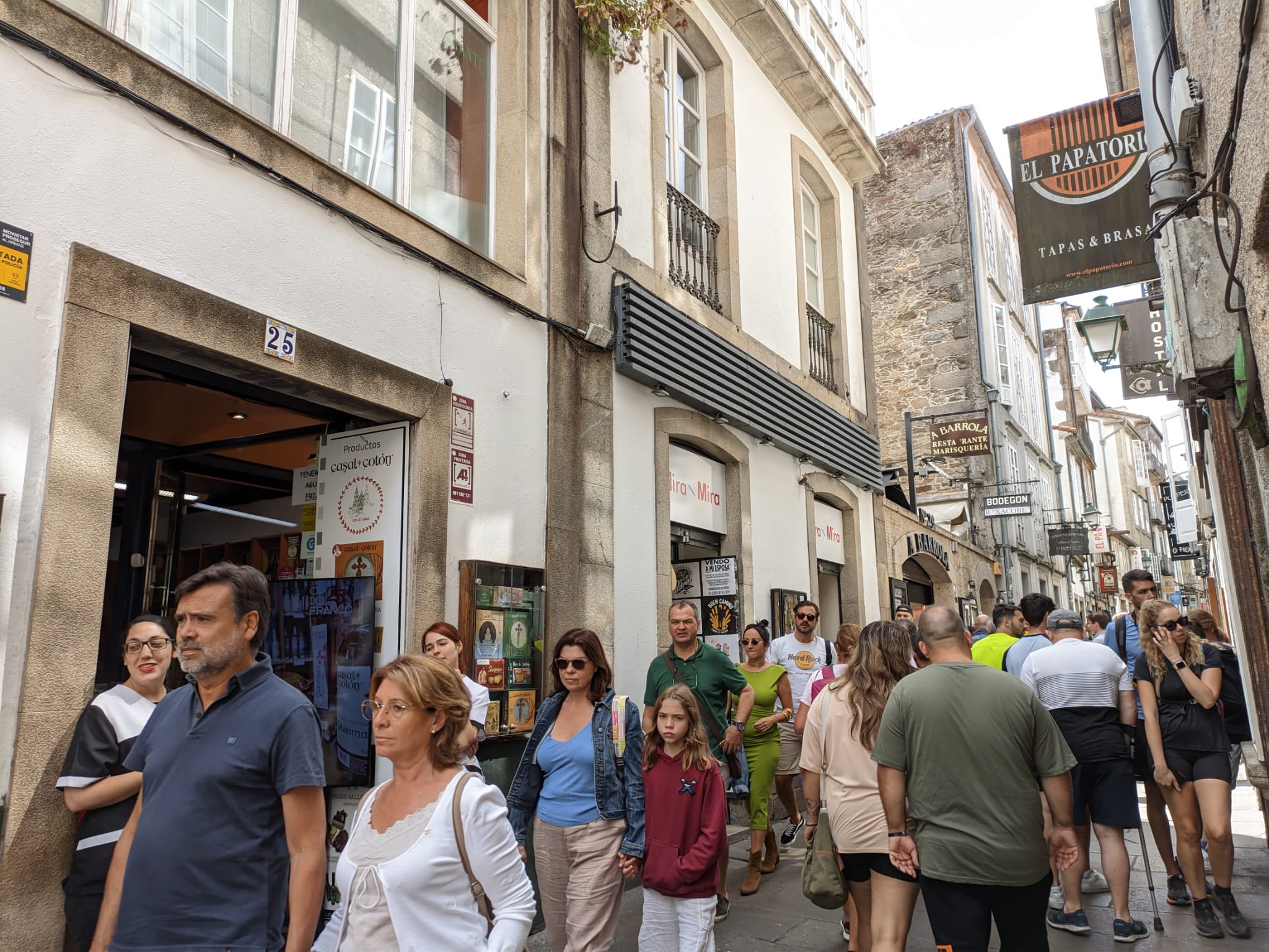 Maar de inwoners van Santiago de Compostella weten wel beter. De aankomst op het plein gaat gespaard met een hoop gejuich en geschreeuw. De stad wordt overspoeld door toeristen. In juli bezochten volgens het Spaans nationale instituut voor statistiek meer dan honderdduizend mensen de stad, dat is meer dan de 96.405 inwoners van de stad. De druk op de stad is daarmee enorm groot, groter dan in de andere Spaanse toeristische bestemmingen zoals Madrid, Barcelona en Sevilla.
