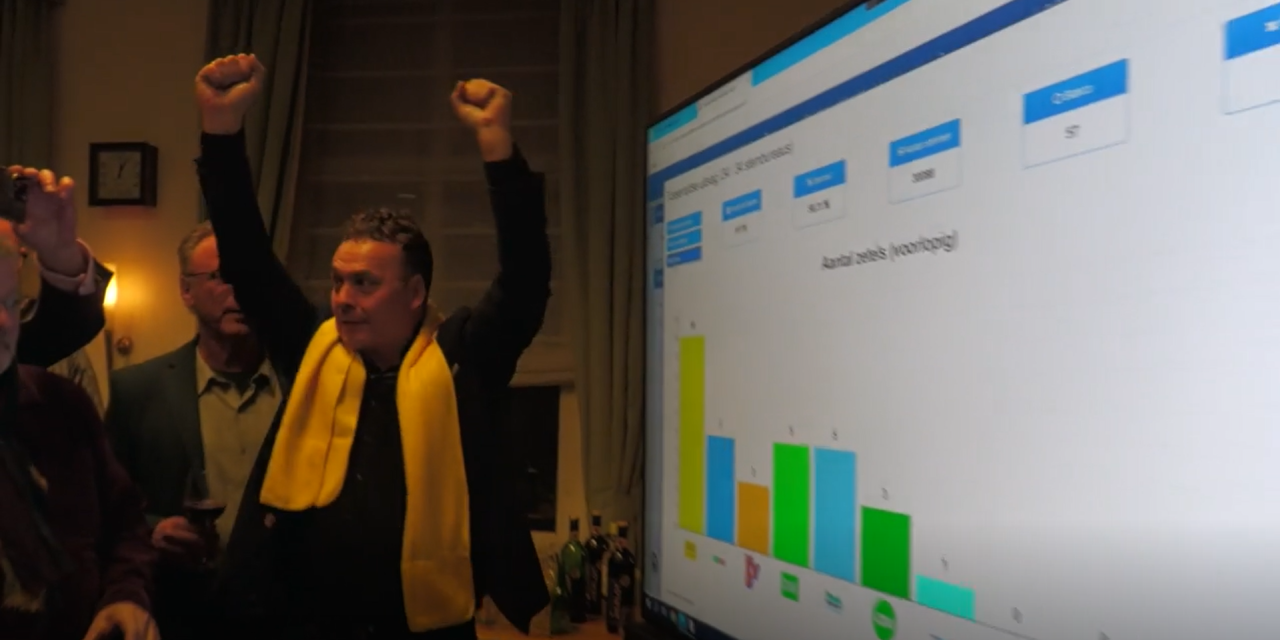 En precies dat gebeurt dan ook, het is 22:00 en de burgemeester staat achterin de zaal en roept door een microfoon om dat de eerste uitslagen binnen zijn. Op het beamerscherm komt een staafdiagram tevoorschijn dat per stembureau, om de beurt, de uitslagen weergeeft. Telkens wordt er luid gejuicht door de partijen die een mooie score hebben gehaald, zo luid dat de burgemeester meermaals vraagt of de zaal wat rustiger kan blijven zodat hij de uitslagen duidelijk kan omroepen.