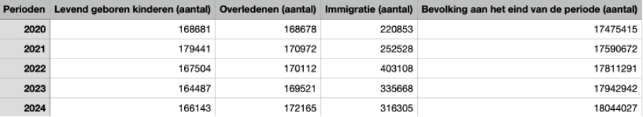 Zo berekenen we bijvoorbeeld de bevolkingsgroei van 2021 naar 2022: het aantal inwoners in 2022 (17.811.291) min het aantal inwoners in 2021 (17.590.672) is een groei van 220.619 mensen. Dat getal delen we door het aantal van het voorgaande jaar,17.590.672 en vermenigvuldigen we met honderd, wat neerkomt op een bevolkingsgroei van ongeveer 1,25%