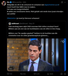 Na afloop van de rellen op het Malieveld maakte de organisator Els Noort een opvallende opmerking op X. “Ik wilde een vreedzame demo. Niet gelukt ook mede door jou vriendjes van AntiFa!”. Deze opmerking was gericht naar Rob Jetten (D66) die Geert Wilders (PVV) beschuldigde van het planten van de zaadjes van de rellen. Maar klopt deze opmerking van Els eigenlijk wel?