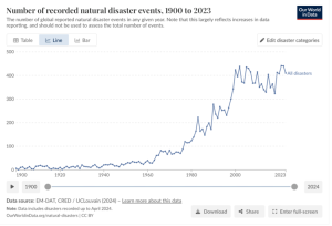 Aantal natuurrampen door de jaren heen. Bron: Our World In Data.