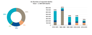 Aantal doden per decennia. Bron: WMO Atlas of Mortality and economic losses from weather, climate and water extremes.