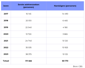 Op CBS StatLine is een tabel over asielverzoeken en nareizigers gepubliceerd. Hieruit blijkt dat tussen 2017 en 2022 in totaal 171.565 eerste asielverzoeken zijn ingediend. In diezelfde periode kwamen daarnaast 60.170 nareizigers naar Nederland. Wanneer deze twee groepen bij elkaar worden opgeteld komt het totale aantal personen dat in deze periode via het asielstelsel naar Nederland kwam uit op 231.735. In de onderstaande tabel zijn deze cijfers geïllustreerd.