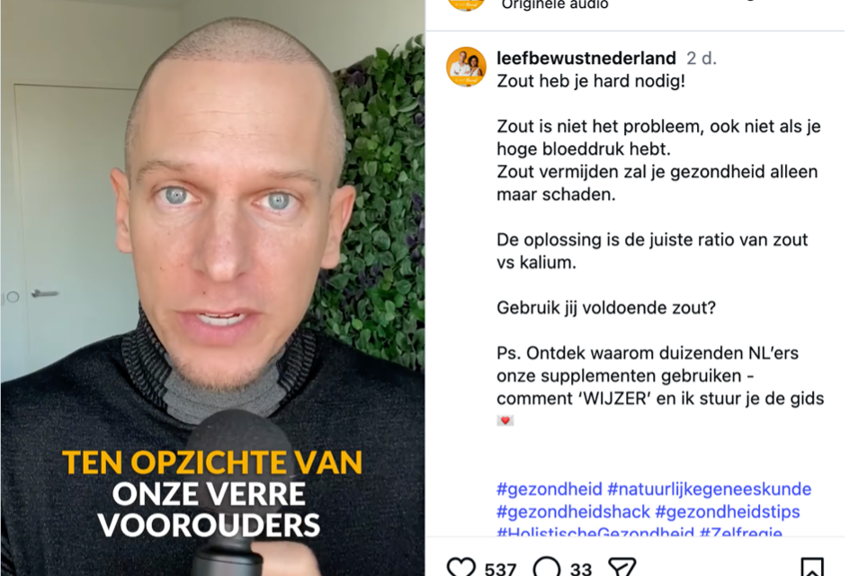 Op Instagram gaan beelden rond van het account Leef Bewust Nederland waarin presentator Mike Verest beweert dat zout niet het probleem zou zijn bij een hoge bloeddruk. Het zou volgens hem verband houden met een tekort aan kalium. Onderzoek laat zien dat deze bewering echter incompleet is en meer nuance vereist.