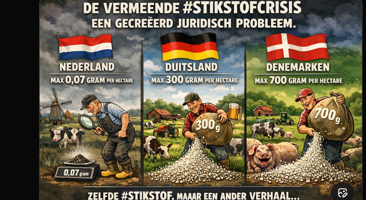 Op het X-account @KritischePatri verscheen een AI-gegenereerde foto waarin de stikstofuitstoot van Nederland, Duitsland en Denemarken vergeleken wordt. Volgens de post stoot Nederland 0,07 gram per hectare uit, terwijl Duitsland 300 gram, en Denemarken zelfs 700 gram stikstof per hectare uitstoot. Er is geen bewijs dat deze bewering ondersteunt.