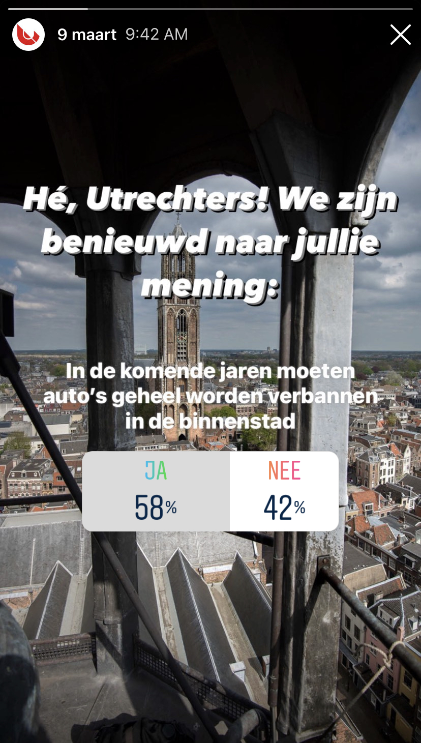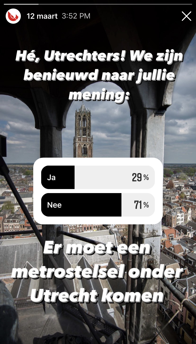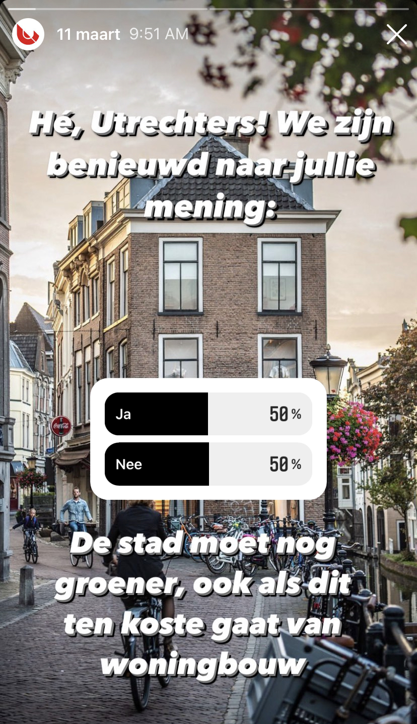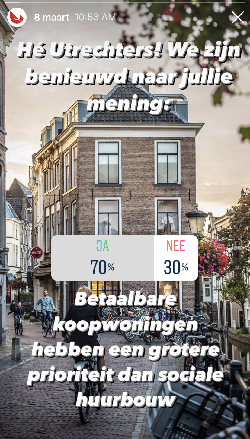 Tussen dinsdag 1 en maandag 14 maart heb ik met een mede-afstudeerder het Instagramaccount van DUIC ingezet om Utrechters meer bij politieke standpunten te betrekken. Met een aantal stellingen wilde we hen laten nadenken wat zij zelf vinden van onderwerpen als woningbouw, groen in de stad en culturele activiteiten in Utrecht. We hebben deze stellingen als polls in de Instagramstories van DUIC op  gepost: