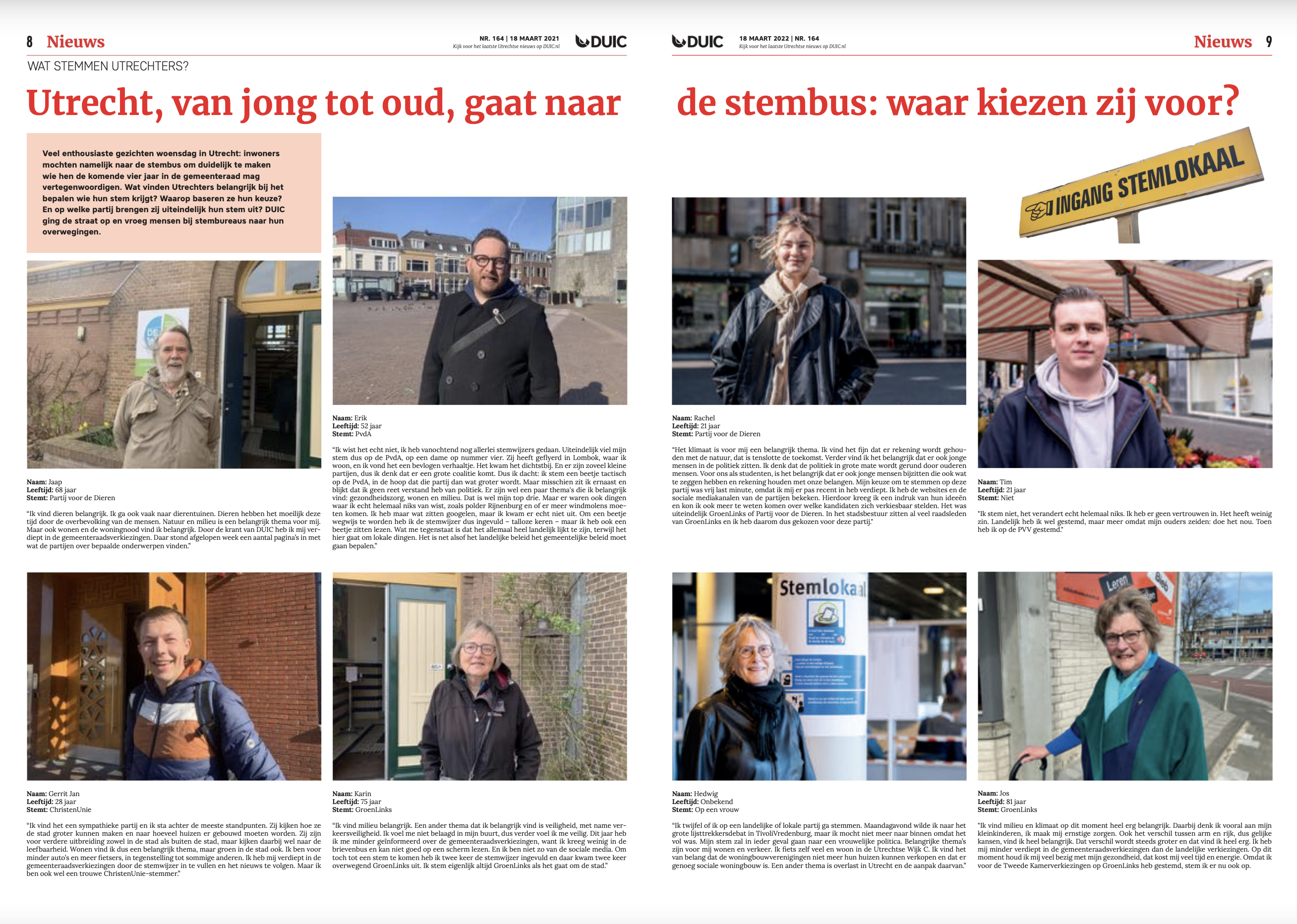 In opdracht van De Utrechtse Internet Courant (DUIC) heb ik met vijf mede-afstudeerders content gemaakt over de gemeenteraadsverkiezingen in Utrecht die op woensdag 16 maart 2022 waren. Klik op de titels van de artikelen om de verhalen te lezen waar ik aan heb gewerkt voor DUIC (aan het liveblog op 16 maart hebben we uiteraard met zijn zessen gewerkt):