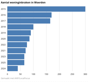 In 2015 werden in Woerden nog driehonderd woninginbraken geregistreerd. Dat getal komt neer op honderd procent van het startniveau. In de jaren daarna is het aantal woninginbraken sterk gedaald. Hoewel er in sommige jaren sprake is van een lichte stijging, blijft de trend duidelijk: woninginbraken komen steeds minder vaak voor in de stad.