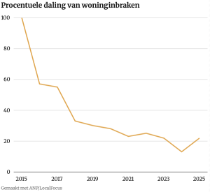In 2025 is een lichte stijging zichtbaar naar vijfenzestig woninginbraken, tweeëntwintig procent van het startjaar. Ondanks deze schommeling blijft de langetermijntrend duidelijk dalend: ten opzichte van 2015 ligt het aantal woninginbraken structureel sterk lager. De procentuele cijfers laten zien dat de grootste afname vooral in de eerste helft van de periode plaatsvond, waarna het niveau relatief laag is gebleven.