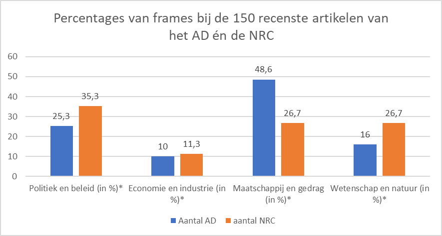 Grafiek met percentages van frames bij de 150 recentste artikelen van het AD én de NRC door Yim Goemans