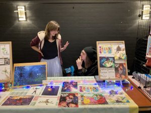Ondertussen helpt De Jong een meisje die geïnteresseerd is in het werk van haar en haar vriendin. De klant wijst naar een tekening van de prinsessen van Super Mario. Zij worden ontspannen afgebeeld hangend op de bank. “We hadden het nog onlangs over Peach en Daisy van Super Mario. Het leuke aan Daisy is dat ze wat stoerder is. Bij Peach denken mensen snel dat zij schattig, aardig en formeel is. Dan ga je een tennismatch met haar aan en is ze keihard bezig in te maken,” vertelt De Jong en kijkt naar haar medekraampjeshouder. Does is het met haar eens en knikt.
