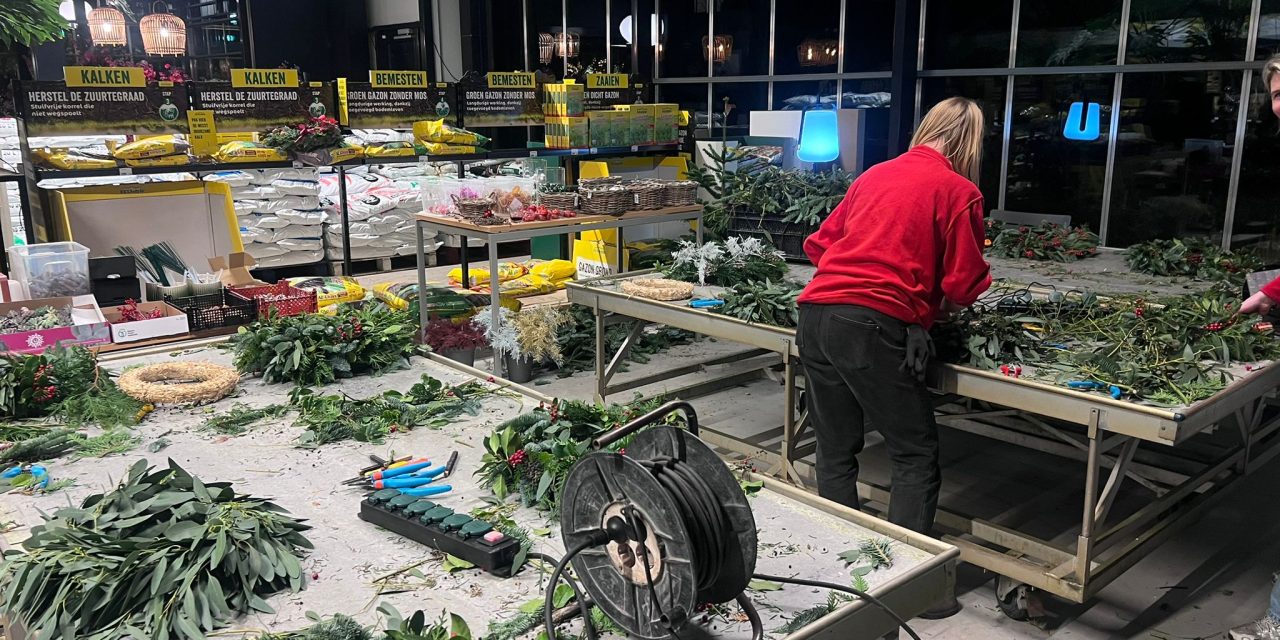 ‘Je begint met het plannen van je datums voor de workshop. Vervolgens moet je dat bekendmaken en kunnen mensen zich hiervoor inschrijven via onze website. Ondertussen bedenkt de bloemist, degene die de workshop geeft, een idee van wat we dit jaar gaan doen en wat we daarvoor aan materialen nodig hebben. Een deel hiervan bestel je en een deel kunnen we zelf knippen in ons tuincentrum.