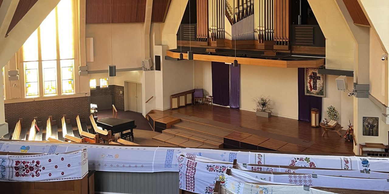 Zeist – Een Oekraïens borduurwerk van inmiddels meer dan 200 meter lang is van 1 tot en met 8 maart te zien in de Oosterkerk in Zeist. Het doek reist door Europa en groeit onderweg steeds verder: in elk land wordt er een nieuw stuk aan toegevoegd. Ook in Zeist borduren mensen mee aan dit bijzondere project. Het stuk dat hier wordt gemaakt, wordt dit weekend aan het grote doek vastgemaakt. Het werk heet een Rushnyk, maar wat is dat precies? Henk Jansen vertelt er meer over in dit videoportret.